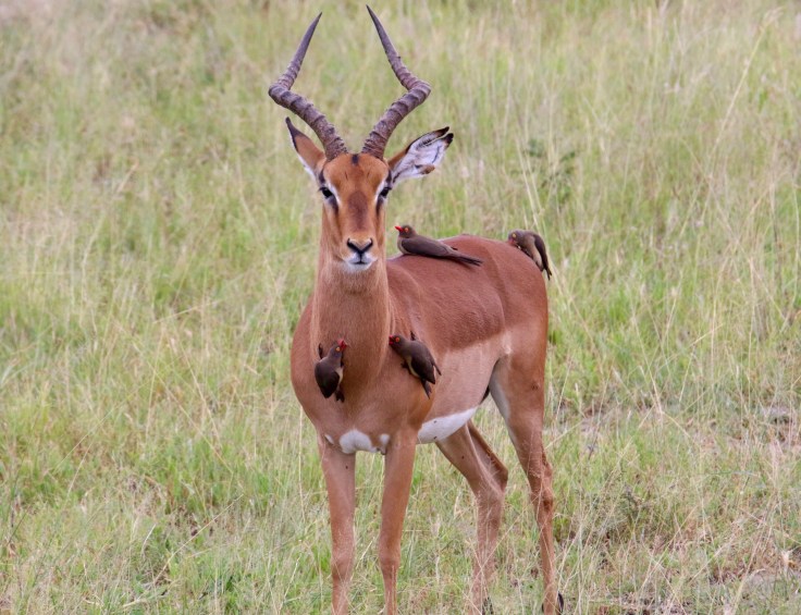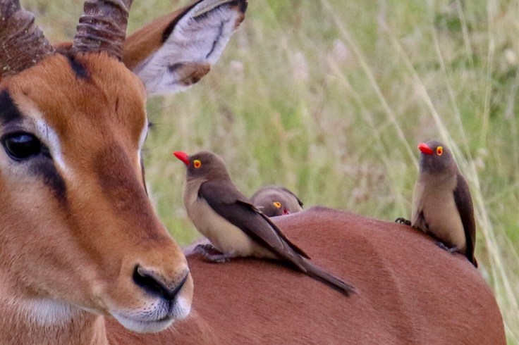 Red-billed Oxpeckers are fairly common in savannah grassland and bushveld regions of Sub-Saharan Africa, but they only occur where there are tick-infested mammals. Their hosts include impala, kudu, zebra, giraffe, buffalo, rhino, as well as domesticated cattle (but not elephants! They will not tolerate oxpeckers!). Even in the absence of their mammal symbionts, Red-billed Oxpeckers are easily recognized. They are starling-sized, plain, brown birds with a diagnostic all red bill and distinctive yellow rings around their bright red eyes. Their bills are pointed and laterally compressed which helps the birds comb through theirs host’s fur and pry out well embedded parasites. They have strong legs and long, particularly sharp claws which enable them to cling onto the sides and backs of their hosts at precarious angles. They also use their short, stiff tails as props.