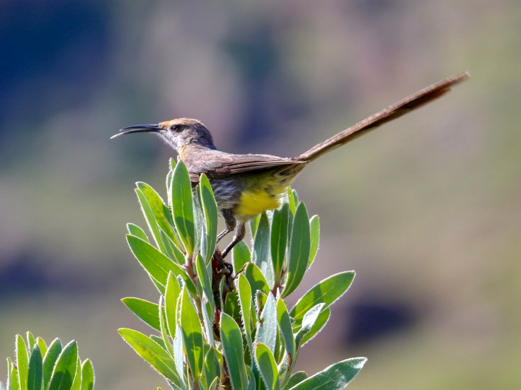 As we gained altitude, the habitat transitioned a Protea-dominated zone with scattered rocky outcrops. Here we encountered our first Gurney’s Sugarbirds.…one of only two species of Sugarbirds, both of which depend on Protea and belong to a family endemic to Southern Africa. These birds are significant pollinators of Protea and meet most of their energy needs from nectar- in fact, they have a long and protrusible tubular tongue that is frilled at the end, a nice adaptation for sipping the sweet stuff! They supplement their diet with insects that are attracted to the flower’s inflorescence.