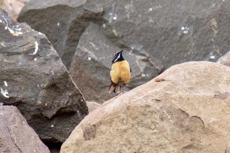 As we climbed through the rocky sections of the pass, we soon encountered one of our primary target birds: the Drakensberg Rockjumper (this was a Rockjumper birding tour, so it would’ve been quite embarrassing if we dipped on this bird!). These insectivorous birds have quite a restricted range and are endemic to the alpine grasslands and rocky outcrops of the Drakensberg, so it was our one and only chance to spot them. These birds could not have been truer to form, as both a male and female jumped from rock to rock. The pursuits of the female paid off as she nabbed an insect meal and the male just posed and looked pretty and afforded us the opportunity to enjoy him! Similar to the sugarbirds, there are two species in the genus Chaetops, which constitutes the entire family that is endemic to southern Africa. Sidenote: if I were a bird, I’d want to be named after a mountain range.