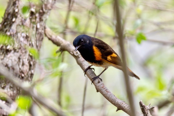 The American Redstart, aka the Halloween Warbler, is a strikingly plumaged Warbler and shares its combination of orange, black, and white with only the Blackburnian Warbler. It is even more distinctive as it forages or defends its territory, as it commonly flashes its wing and fans its tail, revealing those brightly colored patches of orange or yellow. Fun fact: this warbler’s scientific name (Setophaga ruticilla) means “red-tailed moth-eater”. After observing this fierce insect hunter, I agree that is a perfectly suitable name! Also, notice the rictal bristles around the base of its bill – these stiff, tapering feathers are more common among flycatchers, and help to catch insects. In fact, American Redstarts and Least Flycatchers often have territorial disputes as they compete for a similar food source.