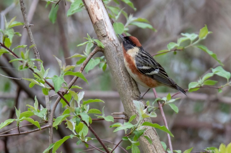 Bay-breasted Warblers breed in the northern coniferous forests of Canada, in thick stands of spruce and fir, where they favor the caterpillars that result from spruce budworm outbreaks. I had a hard time getting good photos of these beautiful warblers, but I just love the combination of their black, cream, and chestnut colors.