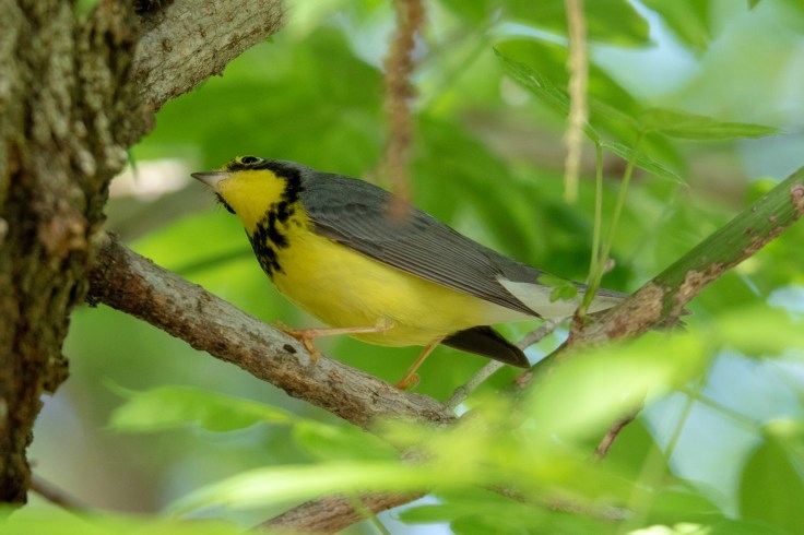 Speaking of necklaces, this Canada Warbler also boasts an impressive one! The bold eyering and spectacles of this sprightly fly-catching warbler gives it a surprised and alert look. The Canada Warbler is tough to observe as it forages in the dense understory, typically feeding among shrubs. I waited quite a long time for this guy to finally pop-up and pose so cooperatively on this fallen tree. The warbler mostly breeds in the boreal forests of Canada, and is the last to arrive and first to leave. It was a real treat to spot this guy from the Magee Boardwalk!