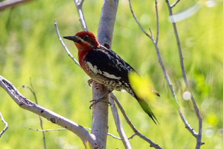 This year, Wildrose did not disappoint. Plumbeous Vireos sang and flitted through aspens and cottonwoods. Up and down the canyon, Lazuli Buntings sang their bouncy and cheerful song and, intermittently, popped up out of the shrubbery and flashed their iridescent blue and turquoise head and back. Such a jewel of a bird! No owls, but I added two new lifers to my list: Virginia’s Warbler and Black-chinned Sparrow. While east of the 395, I chased down a reported Grace’s Warbler (my first in California) and had an incredible encounter with a pair of Williamson’s Sapsuckers feeding a nestling, before heading back to Mammoth Lakes to explore the Valentine Camp Reserve.